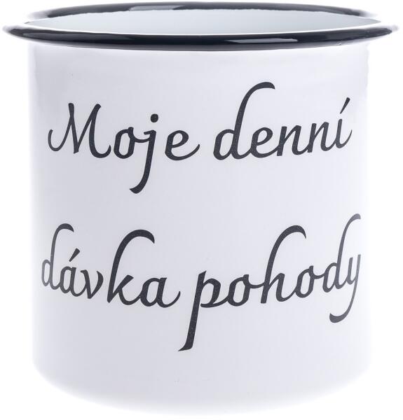 Ez a nagy zománcozott bögre, amelyen a kedves felirat „Moje denní dávka pohody (A napi adag nyugalmam) olvasható, egy stílusos edény, amelyben italokat szolgálhat fel, vagy egyszerűen csak díszként állíthatja az asztalra. Könnyű, ezért ha leejti, nem törik össze. A hagyományosan feldolgozott zománc ütés vagy esés hatására lepattoghat, ami azonban a termék varázsának része. A zománc mosogatógépben mosható, de mikrohullámú sütőben nem használható. Ne tisztítsa drótkefével vagy durva szivaccsal. A bögre ajándéknak is kiváló.