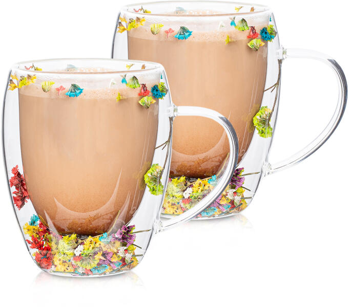 Fedezze fel a Flowers egyedi termo poharak varázsát, amelyek az elegancia és a praktikus előnyök egyedülálló kombinációját nyújtják. Ami azonban igazán megkülönbözteti ezeket az üvegeket, az a gyönyörű színes virágokkal töltött duplafalú üvegek közti tér. A poharak nemcsak mindennapi használatra alkalmasak, hanem különleges alkalmakra is, amikor különleges hangulatot szeretne teremteni és lenyűgözni vendégeit. Eredeti ajándékként is remekül használhatóak. A Thermo poharak kézzel készültek könnyű, hőálló, duplafalú boroszilikát üvegből, amely a kialakult vákuumnak köszönhetően hosszú ideig képes megtartani az ideális hőmérsékletet, és nem adja át a hőt vagy hideget a külvilágnak. Hőszigetelő tulajdonságainak köszönhetően a pohár hűvös marad, és nem ég meg még forró ital használata esetén sem. Hideg italok esetében az üveg külső fala nem harmatozik, így az ital nem forrósodik fel gyorsan, és a jég sem olvad meg. A boroszilikát üveg előnye a hagyományos üveggel szemben a magas és alacsony hőmérsékletekkel, a mechanikai sérülésekkel és a vegyi anyagok hatásával szembeni nagyfokú ellenálló képessége.