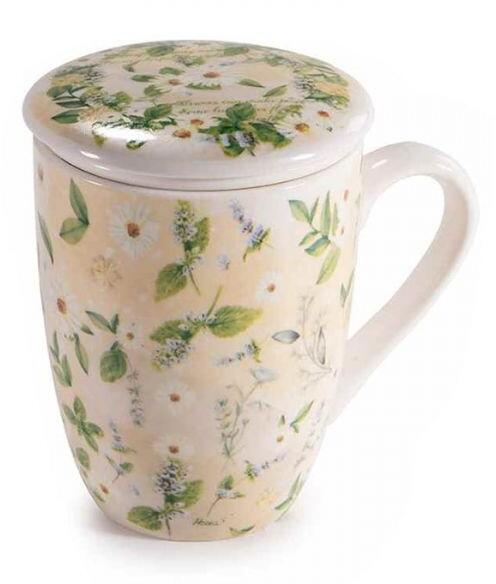 Stílusos, gyógynövény virágos mintájú porcelán teásbögre praktikus szűrővel és tetővel.