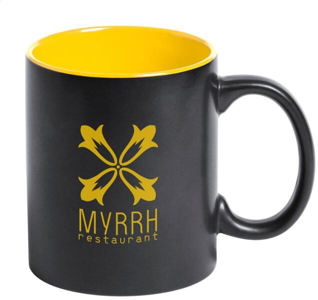 Fekete kerámiabögre, színes belső résszel, 350 ml. A gravírozott logó a bögre belsejével megegyező színű. Dobozban szállítjuk.