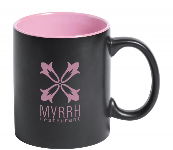 Fekete kerámiabögre, színes belső résszel, 350 ml. A gravírozott logó a bögre belsejével megegyező színű. Dobozban szállítjuk.