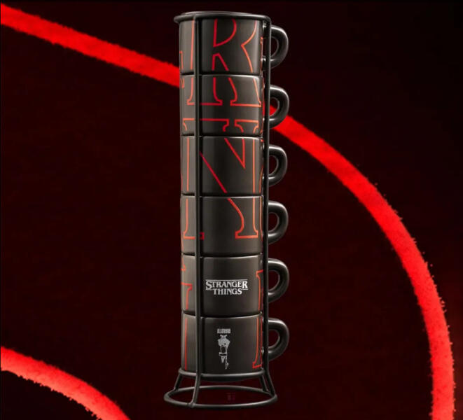 Ez a rakásolható csészékből álló készlet hat fekete eszpresszó csészéből áll, melyeket az ikonikus Stranger Things felirat díszít. A sötétben világító hatásnak köszönhetően a piros felirat ragyog, újraalkotva a sorozat legendás logóját, így a kávézás minden alkalommal különleges élmény lesz.