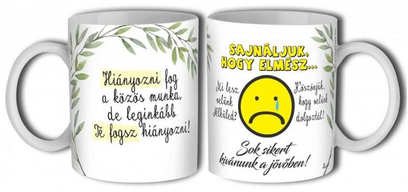 Bögre - Sajnáljuk, hogy elmész  - Ajándék kolléga búcsúztatóra Felirat:Sajnáljuk, hogy elmész... Mi lesz velünk nélküled? Köszönjük, hogy velünk dolgoztál! Hiányozni fog a közös munka, de leginkább Te fogsz hiányozni. ! Sok sikert kívánunk a jövőben! Anyaga: kerámia Űrtartalom: 3dl Szélesség: 8cm Magasság: 9,5cm Tisztítás: Mosószeres meleg víz Egyedi és különleges ajándékötlet kollégának, kolléganőnek búcsúztatóra.