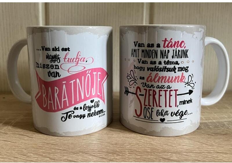 Bögre – Barátnőnek   Felirat: Van az a tánc amit mindennap járunk Van az a téma hogy valósítsuk meg az álmunk. Van az a szeretet minek soha nem lehet vége. Van aki ezt úgyis tudja hiszen van Barátnője. és a legjobb te vagy nekem, Egy barátnő nagy kincs mindenki számára.   Nem mindig vagytok ott egymásnak, de tudjátok , hogy a másikra bármikor lehet számítani. Amikor a Tőled kapott bögrét használja, mindig eszébe jutsz majd. Ajánljuk születésnapokra, névnapokra vagy amikor meglepnéd őt. Űrtartalma: 3 dl – Befogó méretei: 8 cm x 9,5 cmSúlya: 0.35 kg