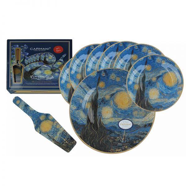 CARMANI Van Gogh Csillagos Éj üveg süteményes készlet tortalapáttal - 6 személyes (IMO-C-198-7551)