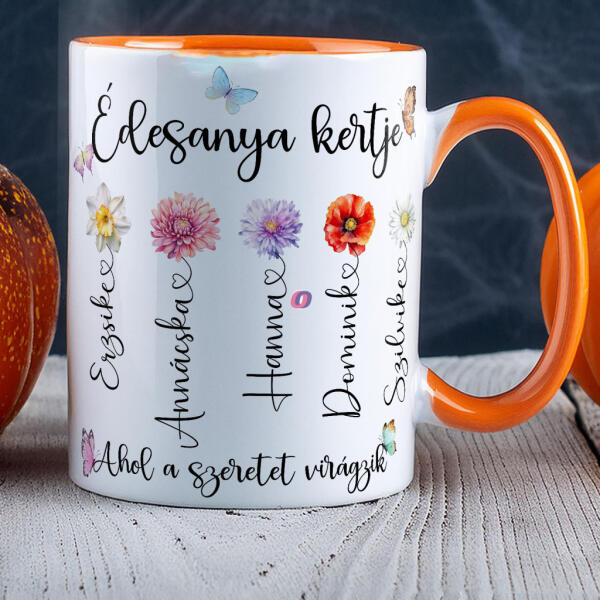 Anyák napi bögre "Anya kertje" egyedi névvel, narancssárga, kerámia kedvező áron, villámgyors szállítással!