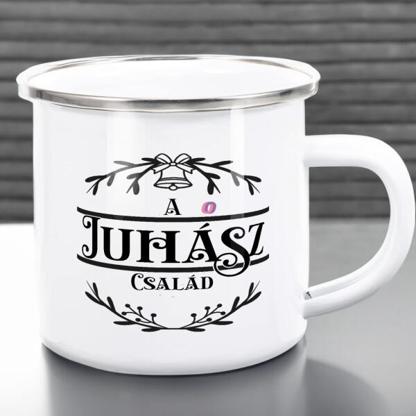 • Egyedi neves karácsonyi bögre "Családneves" 360 ml zománcozott fém Full HD