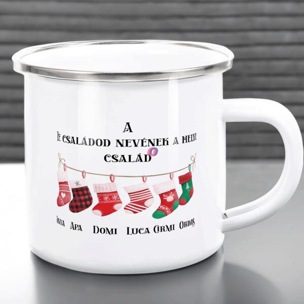 • Egyedi neves karácsonyi bögre "Harisnyás család" 360 ml zománcozott fém Full HD