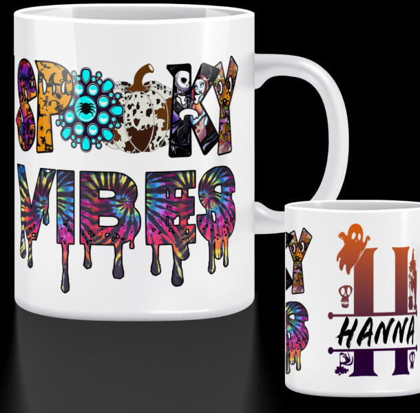 Személyre szabható Halloweeni bögre, Spooky vibes 300ml fehér. Kiváló minőségű Halloweeni dekorációs kiegészítő, de szuper ajándék is lehet