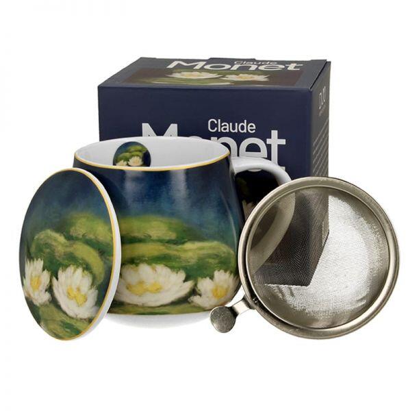 Monet Vízililiom c. képével díszített öblös 430 ml-es porcelán bögre fémszűrővel. Díszdobozos.