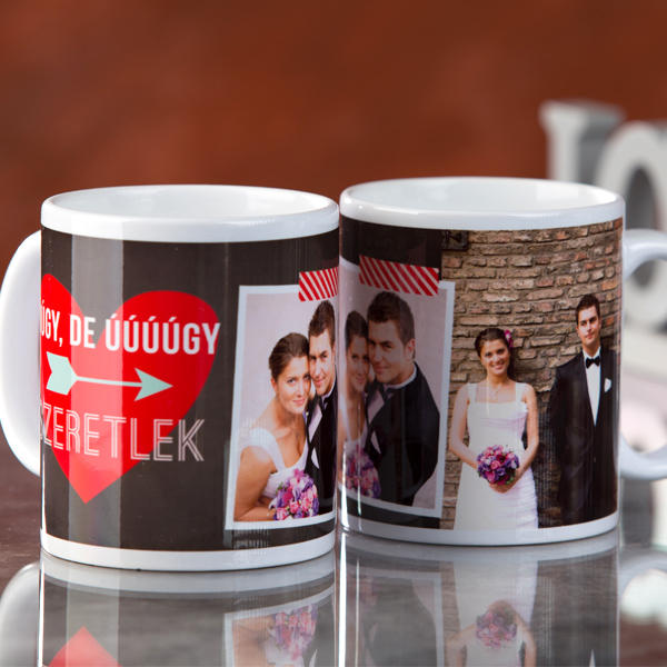 Ha szeretné valami különlegesebb ajándékkal meglepni párját Valentin nap alkalmából, akkor remek meglepetés lehet egy szívecskével és 2 db fényképpel ellátott egyedi fényképes bögre, amely grafikájában a boldogságot és szerelmet szimbolizálja.