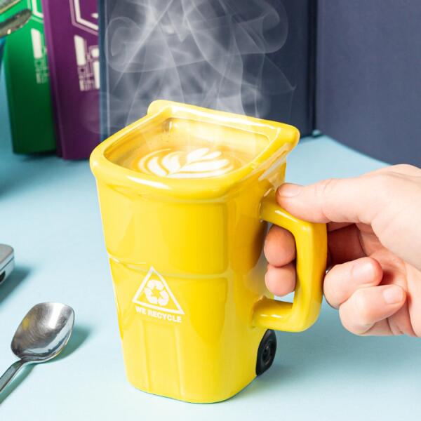 • Egyedi dizájn:  Kuka formájú bögre újrahasznosítási logóval – vidám, mégis elgondolkodtató kiegészítő.