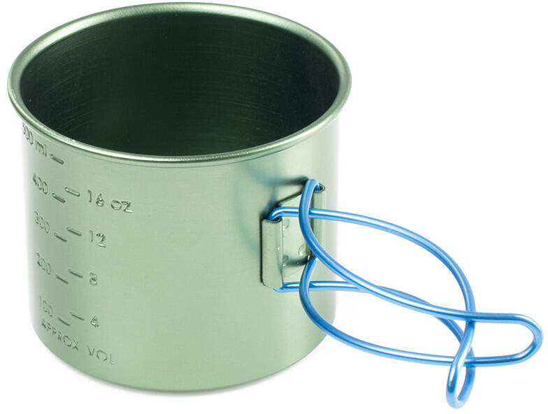 A könnyű, 591 ml térfogatú GSI Bugaboo Bottle Cup csésze eloxált alumíniumból készült. A behajtható fülnek köszönhetően kis helyen is elfér.   A könnyű, 591 ml térfogatú GSI Outdoors Bugaboo Bottle Cup csésze eloxált alumíniumból készült. A behajtható fülnek köszönhetően kis helyen is elfér. A csésze úgy van megtervezve, hogy beleférjen a klasszikus 1 literes palck. A csészén skála is található. A csésze ellenáll az oxidációnak és mechanikailag nagyon tartós, de közvetlen lángon nem használható.