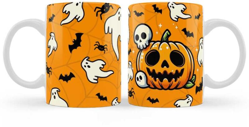Halloween Témájú Bögre - Tökéletes Ajándék és DekorációEz a vidám  Halloween témájú bögre  tökéletes a Halloween szezonra. Élénk narancssárga háttérrel rendelkezik, amelyet klasszikus rémisztő motívumok díszítenek, mint például fehér szellemek, fekete denevérek és egy nagy vigyorgó tök, amely egy kis játékosságot ad hozzá. A dizájnt kis fehér koponyák teszik teljessé, amelyek hozzájárulnak a hátborzongató Halloween hangulathoz.