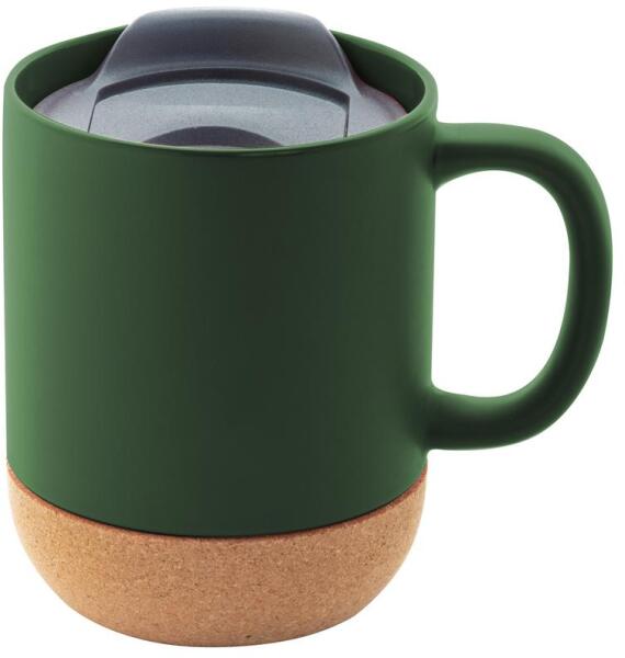 Magas minőségű kerámia bögre természetes parafa alappal és PP műanyag ivófedéllel. Kívül matt, belül fényes felülettel. 325 ml. Kraft papír dobozban.