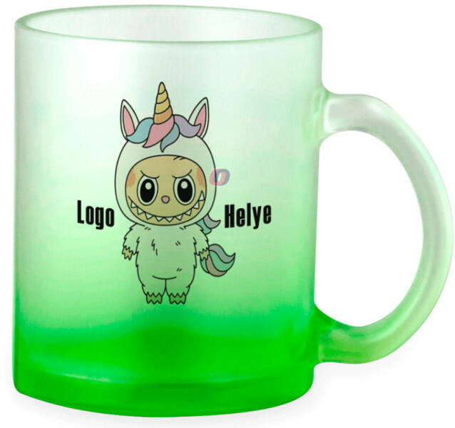 Prémium logózott, fényképes üveg bögre, egyedi grafikával 350 ml átmenetes Zöld. Kiváló minőségű dekorációs kiegészítő, de szuper ajándék is lehet