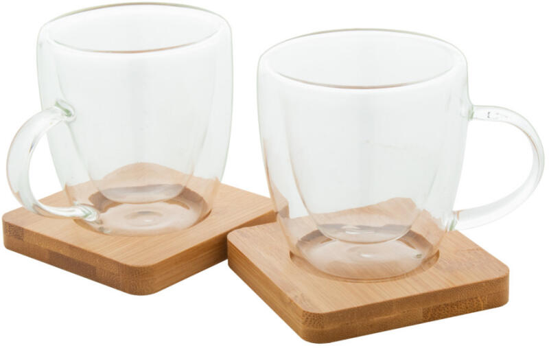 Duplafalú csészekészlet boroszilikát üvegből, 2 db csészével és bambusz csészealjjal, 90 ml. Kraft papír dobozban szállítjuk.