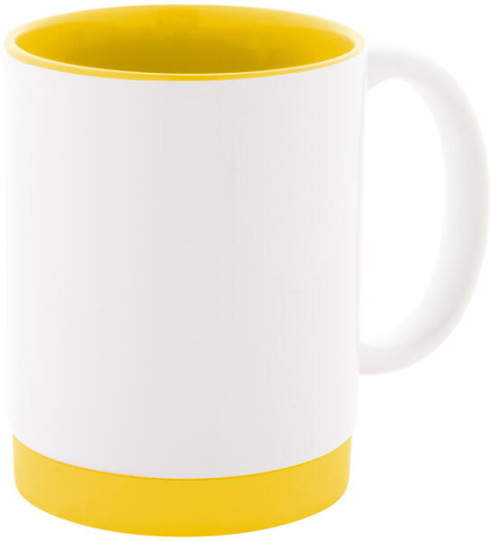 Szublimációs kerámia bögre színes belsővel, alján hozzáillő színű szilikon gyűrűvel, 300 ml. Fehér papírdobozban.