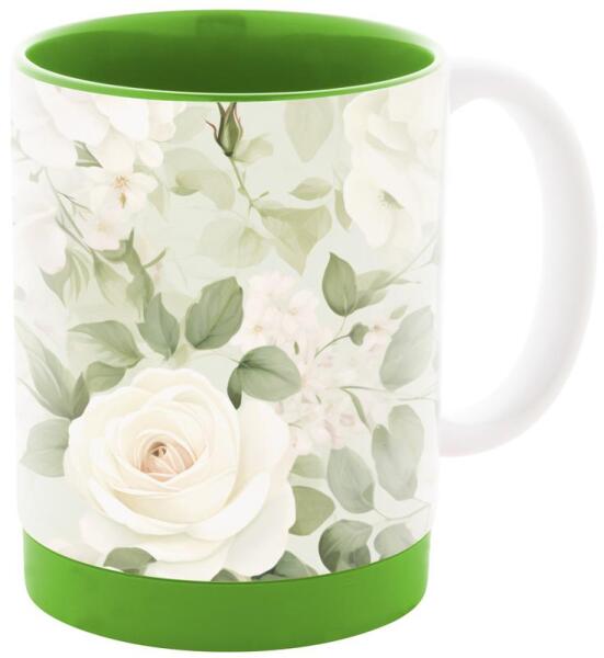 Szublimációs kerámia bögre színes belsővel, alján hozzáillő színű szilikon gyűrűvel, 300 ml. Fehér papírdobozban.