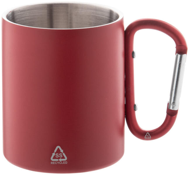 Duplafalú, újrahasznosított rozsdamentes acél thermo bögre, megegyező színű újrahasznosított alumínium karabineres fogantyúval. 300 ml. Kraft papír dobozban szállítjuk.