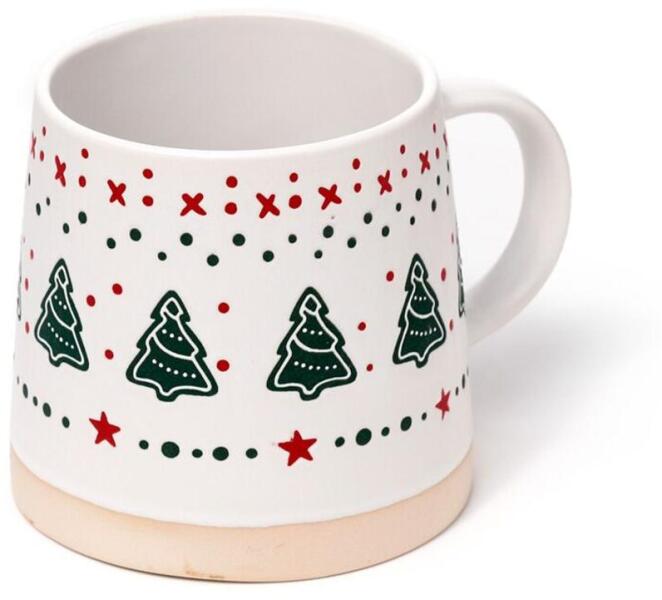 Kezdd a napodat igazi ünnepi hangulatban ezzel a gyönyörű karácsonyi kőkerámia bögrével ! A fehér alapon zöld karácsonyfákkal és piros csillagokkal díszített bögre melegséget és vidámságot visz a reggeli kávé, forró csoki vagy tea mellé. Praktikus és stílusos választás a téli hónapokban, hiszen a 420 ml-es űrtartalom pont ideális egy kiadós forró italhoz. Ráadásul mikrohullámú sütőben és mosogatógépben is használható, így nemcsak szép, hanem rendkívül praktikus is. Termékjellemzők: