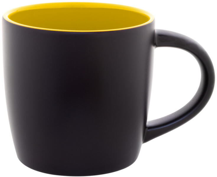 Fekete kerámia bögre színes belsővel, 300 ml. Speciális bevonattal rendelkezik, a gravírozott logó megegyezik a belső színnel. Kraft papír dobozban.
