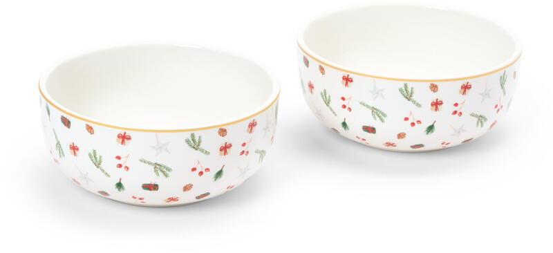 2 tál Szín: Karácsonyi mintás fehér Anyag: Porcelán Méretek: Magasságuk egyenként: kb. 6 cm Ø egyenként: kb. 14 cm Tartalom: Mikrohullámú és hagyományos sütőben való használatra és a megfelelőségre vonatkozó tájékoztatóval Töltőtömeg: Egyenként kb. 450 ml Használati tudnivalók: Mikrohullámú sütőben csak melegítésre használhatók, főzésre nem Figyelmeztetések: FIGYELEM. Mikrohullámú sütőben és hagyományos sütőben csak melegítésre használható – főzésre nem alkalmas Minőségi porcelánból Karácsonyi mintaAranyszínű díszítésselMosogatógépben tisztíthatókŰrtartalom: kb. 450 l