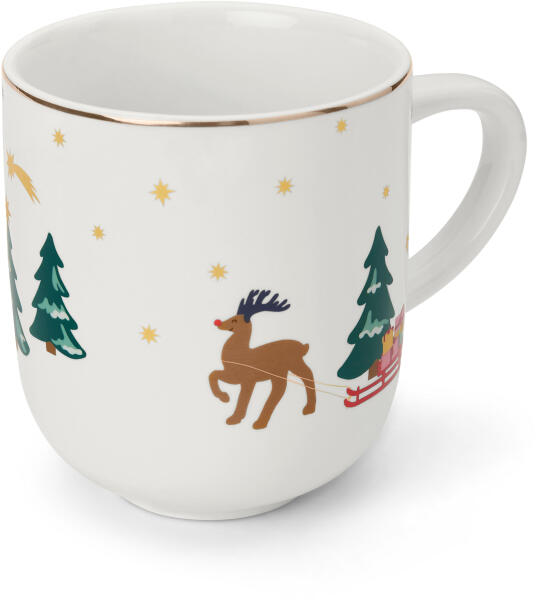 Nagyméretű bögre, karácsonyi mintával Szín: Krémfehér színes díszítéssel Aranyszínű perem Anyag: Bögre és fedél: porcelán Méretek: Magasság: kb. 11 cm Ø: kb. 10 cm, Ø alul: kb. 5 cm Tartalom: Megfelelőségi, valamint a mikrohullámú és hagyományos sütőben történő használatra vonatkozó tájékoztatóval Súly: Kb. 390 g Töltőtömeg: Kb. 470 ml A termékhez mellékelt használati és kezelési útmutatót a forgalmazó on-line formában is biztosítja, amely a „Letöltés – használati útmutató linken érhető el, illetve tölthető le. Minőségi porcelánbólAranyszínű díszítéssel a bögre pereménSzép karácsonyi motívummalHasznos űrtartalom: kb. 470 ml50 °C-ig mosogatógépben tisztítható