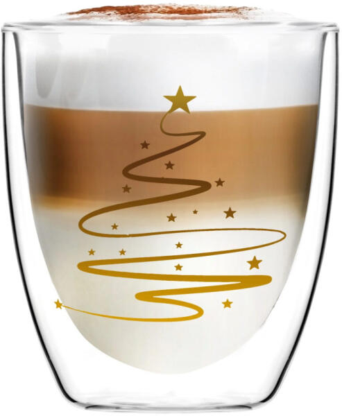 Két darabos Amo duplafalú csésze készlet karácsonyi kiadásban, arany színű díszítéssel. A termék kézzel készül, a legmagasabb minőségű boroszilikát üvegből, amely ellenáll mindenféle mattulásnak és hőhatásnak. A dupla falnak köszönhetően a csésze hosszabb ideig megőrzi az ital kívánt hőmérsékletét, valamint véd az égési sérülések ellen is . További előnye, hogy az italok fantasztikusan mutatnak a csészében. A poharak ergonomikus formája megakadályozza, hogy kicsússzanak a kezünkből, még akkor is, ha nem a fogantyúnál fogva tartjuk a poharat. Tökéletes forró és hideg italok tálalásához egyaránt. A poharak minimalista, egyszerű formájuknak köszönhetően jól illeszkednek más, modern és klasszikus étkészlethez. Minden asztal vitathatatlan dísze vagy tökéletes, stílusos ajándék. Leírás: Űrtartalom: 250 ml