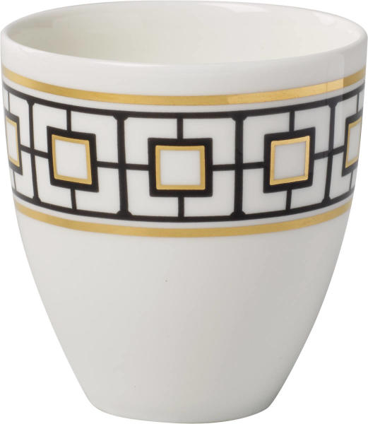 Klasszikus fül nélküli teás csésze art deco mintával A MetroChic Gifts ajándékkollekció egy igazán különleges készlete a Villeroy & Bochnak. A különlegesen ellenálló csontporcelánból készült készlet minden darabját a fehér, fekete és az arany színek díszítik, geometrikus mintázattal. Az art deco stílusú MetroChic Gifts a MetroChic étkészlet nagyszerű kiegészítőjévé válik, amikor különleges alkalmakkor egyedi terítékkel szeretné lenyűgözni vendégeit – ráadásul, mint ahogy a neve is utal rá, a kollekció darabjai ajándékként is nagyszerűek.