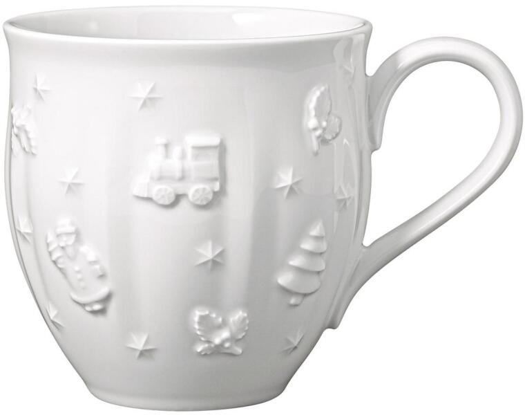 Nagy méretű porcelán bögre domború karácsonyi mintákkal A Villeroy & Boch Toy's Delight kollekciója a 2010-es megjelenése töretlen népszerűségnek örvend. És ez nem is csoda, hiszen az apró szórt mintákkal díszített, önmagát komplett étkészletté kinőtt kollekció a bájos megjelenésével egy-kettőre karácsonyi hangulatot teremt bármely étkezőasztalon. A kollekció a színes változaton túl a fehér színű, dombornyomott mintájú Toy's Delight Royal Classic változattal válik igazán teljessé. A termékcsalád része ez a nagy méretű bögre is, melyből a reggeli kakaó, a nagy adag tea vagy épp a finom forralt bort lehet különleges tálalásban kortyolni. Csempésszen karácsonyi hangulatot a téli mindennapokba a Villeroy & Boch porcelánjaival!