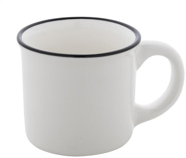 Mini vintage kerámia bögre fekete peremmel, belül fehér kívül színes bevonattal, 90 ml. Kraft papír dobozban.
