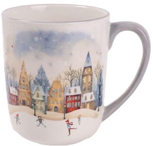 A bögre oldalán festett havas kisvárosi táj és korcsolyázó gyerekek elevenítik meg az ünnepi hangulatot, így minden korty forró ital egy kis mesevilágba repít.
