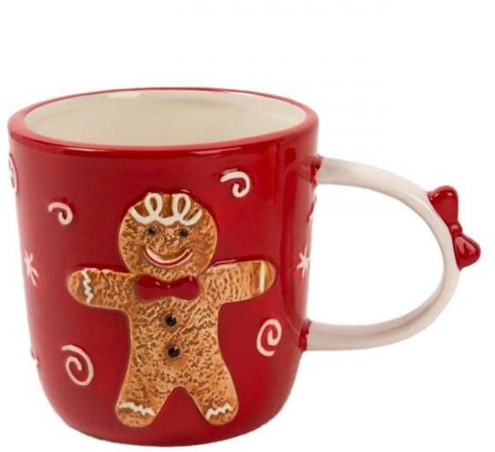 A bögre piros alapszíne, 3D-s mézeskalács figura díszítése és masnis fül kialakítása igazán meghitt, vidám karácsonyi hangulatot teremt.